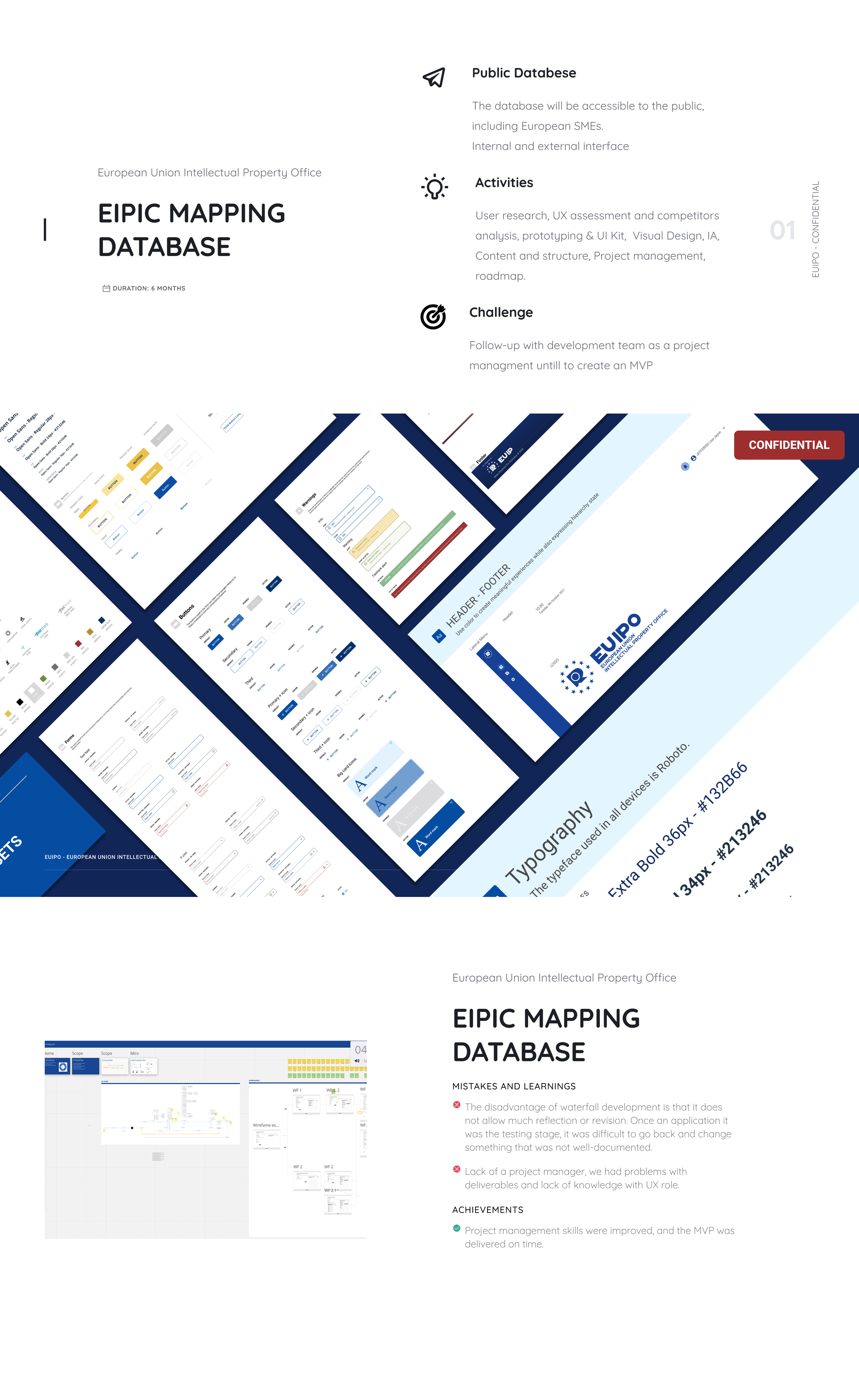Diagrama de un proyecto llamado 'EIPIC MAPPING DATABASE' con secciones de actividades, desafíos y logros, mostrando varias pantallas de diseño y tipografía del proyecto.